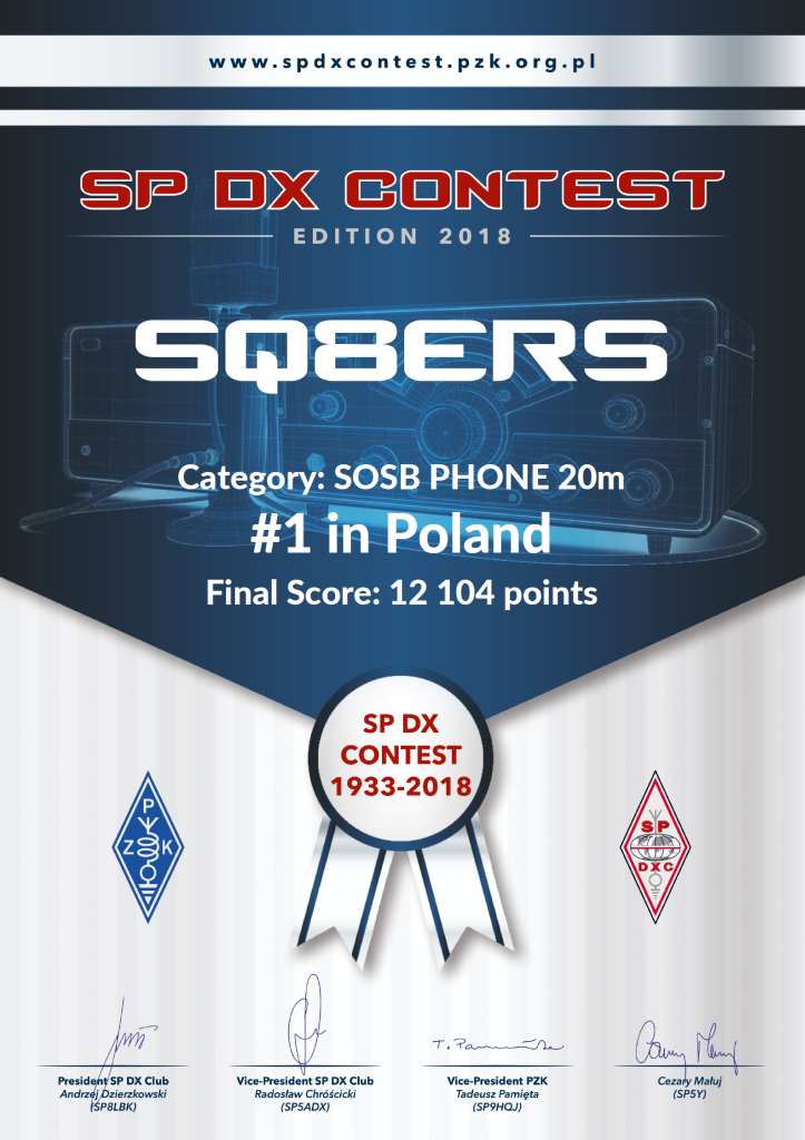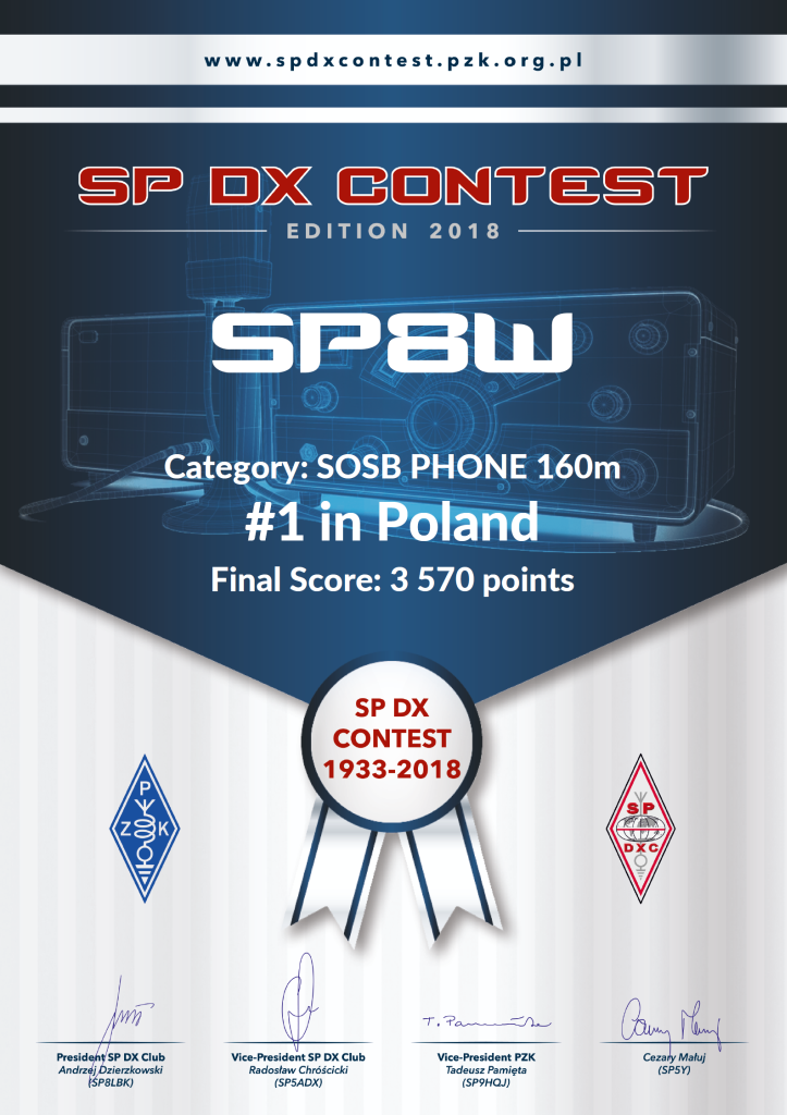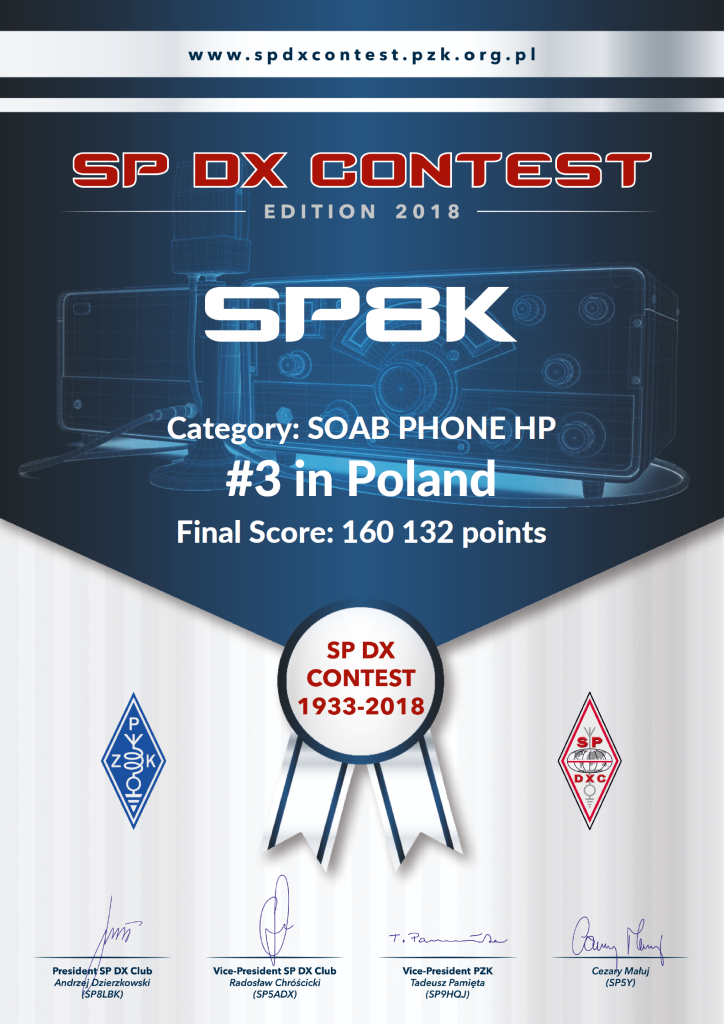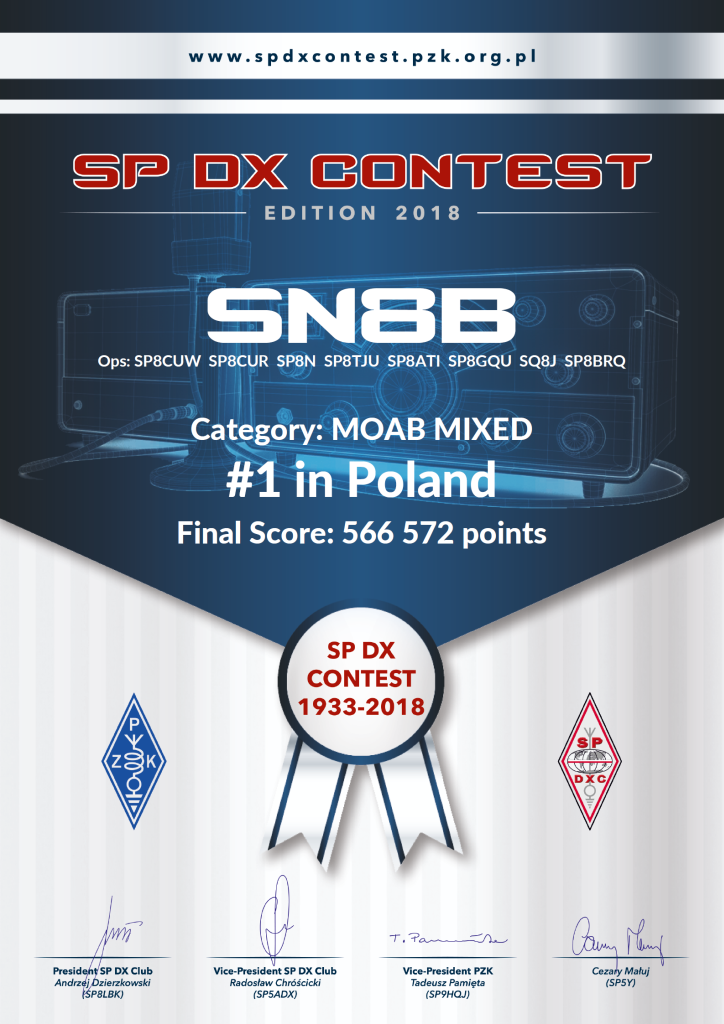 (op. Marek SP8CUW, Łukasz SP8CUR, Adam SP8N, Łukasz SP8TJU, Krzysztof SP8ATI, Jurek SP8GQU, Kuba SQ8J, Andrzej SP8BRQ) przeprowadzając 2075 QSO i uzyskując wynik 566572 punkty. - W kategorii SOAB PHONE – III miejsce zajął Kornel SP8K