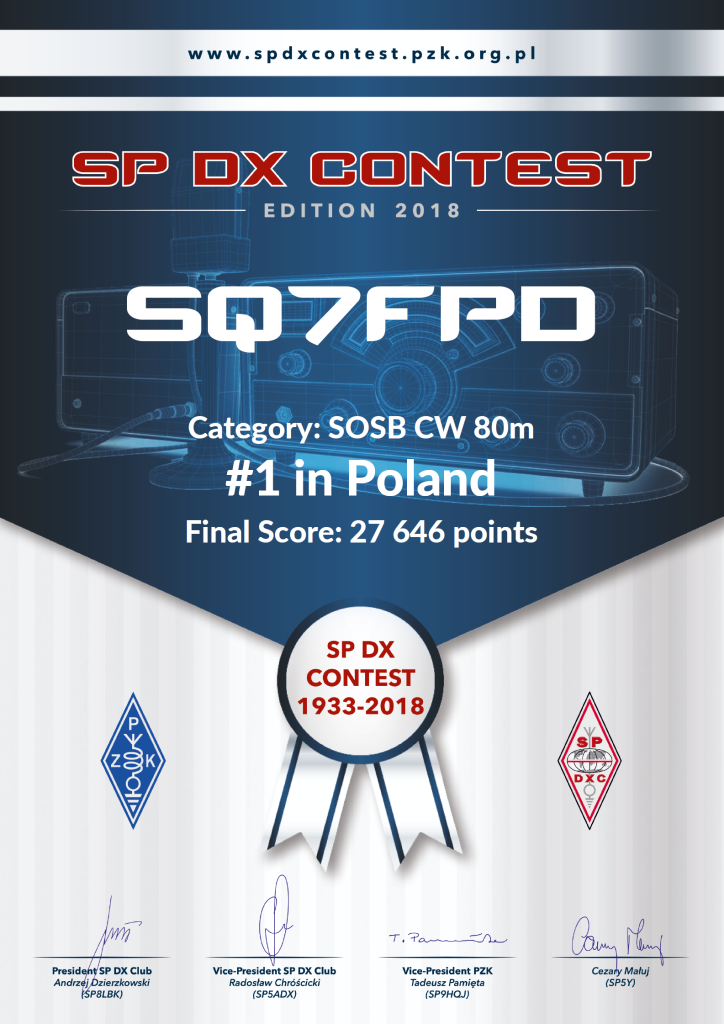 - W kategorii SOSB CW 80M – I miejsce zajął Darek SQ7FPD
